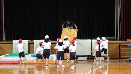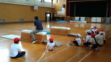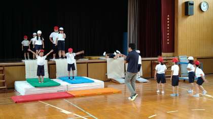 初めに感覚づくりをおこなったあと、舞台を使った動きをしています。次に連結跳び箱を準備して開脚跳びにつながる動きをしています。