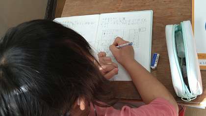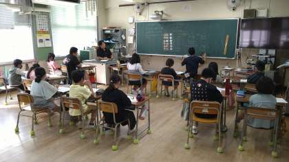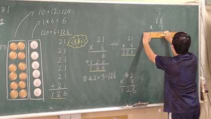 2けた?1けたのかけ算です。学習途中で困ったことがあれば、わかっている児童が説明するということを繰り返しています。また、ペアでの話し合いを取り入れて意見交流もおこなっています。