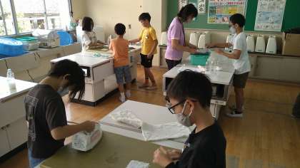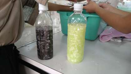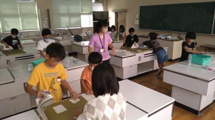 最後はやってみたいこと中心に作業しています。あるグループは、牛乳パックを細かくし、水に混ぜたところに絵の具で色をつけています。どんな仕上がりになるでしょうか。