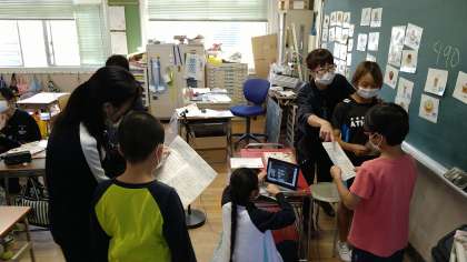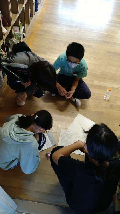 グループの中でお店役とお客役をしています。この時間は、グループでの練習となっています。次の学習以降でみんなの前で順に発表する予定です。