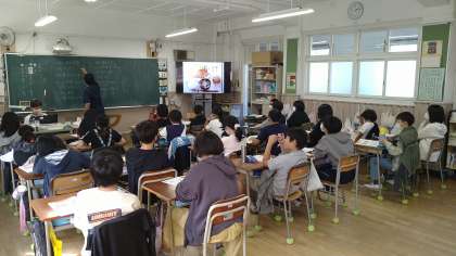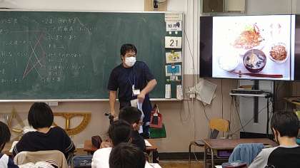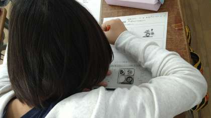 2枚の配膳された食事の写真を見比べています。共通点を見つけワークシートに書き込んでいます。