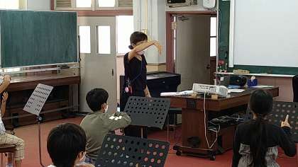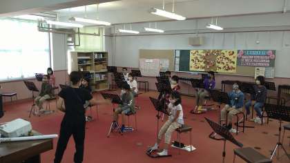 息をたくさん吸って、細く長く声を出す練習をしています。ドレミファソラシドの音階をハンドサインで表しながらの発声もしています。