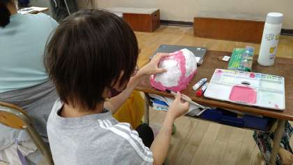 乾燥したお面に色を塗っています。モチーフにした題材がある児童はそれにあわせた色をオリジナル作品は自分で考えた色を塗っています。