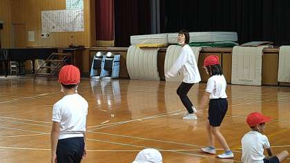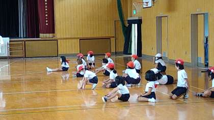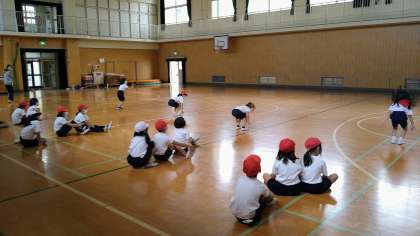 体を移動する運動(遊び)をしています。「ワン、ツー、ピョン、ピョン。」のかけ声に合わせて「片足、片足、両足、両足。」と前方へ跳んで移動する動きを楽しんでいます。