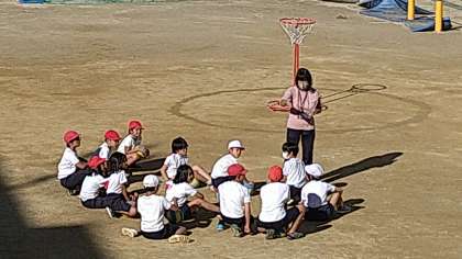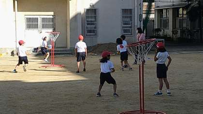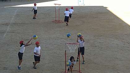 昔のポートボールからゴールを守る役割をなくしたゲーム運動です。ゲーム運動はルールを子どもたちにあわせて工夫することも楽しみの一つです。最後に試しのゲームをしています。
