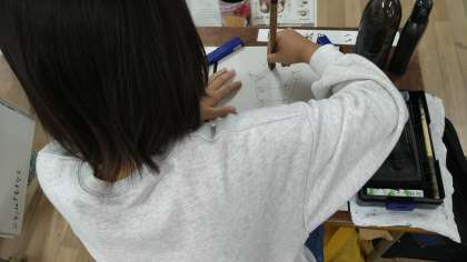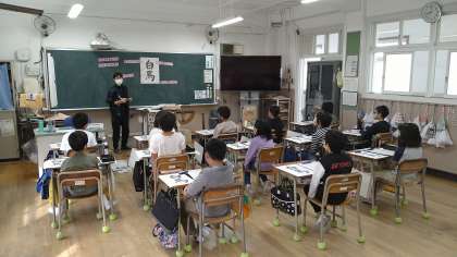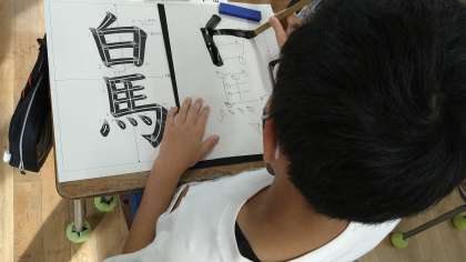 初めにいつもの注意事項(墨汁をつけるところ、軸をまっすぐ立てるなどを)を確認しています。今日は半紙ではなく、書くポイントがプリントされたコピー用紙に書いています。