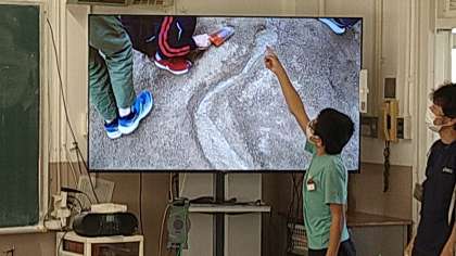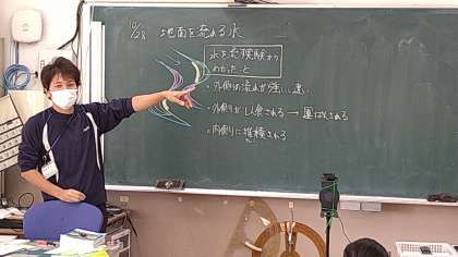 運動場の端にある築山を山に見立てて流れる水の働きについて考えています。水の流れの速さ、内外の川岸の様子を前時の学習の映像を見て気づいたことを発表しています。