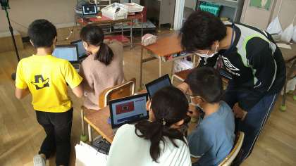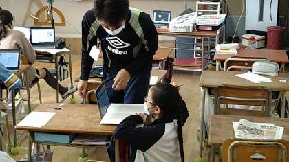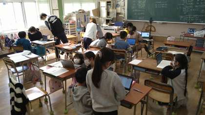 「和の文化を受けつぐ」を学習したあと、子どもたちに和の文化でパンフレットを作ることを説明しました。どのようなものがあるか意見を出させてから、グループを決めて調べています。