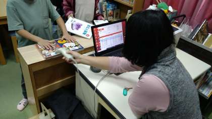 東小橋小学校では、スクールプロというソフトを使って図書館の本を管理しています。そのため本の貸し出しと返却は本のバーコードを「ピッ。」と読み取れば完了します。
