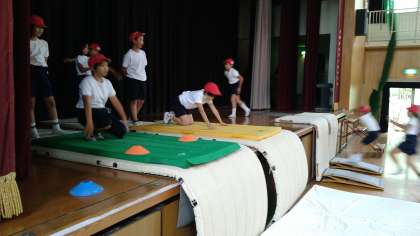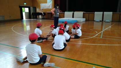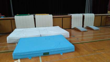 とび箱運動の台上前転につながる運動をしています。場の工夫をしてスモールステップで確実に身につけられるようにしています。