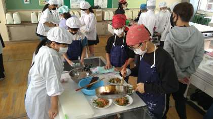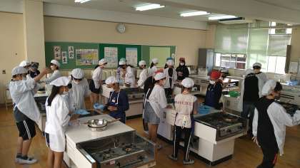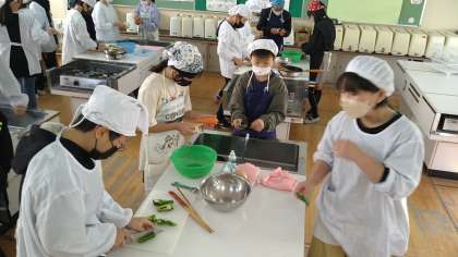 「いろどりいため」を作っています。玉ねぎ・にんじん・ピーマンの3種類の野菜とハムをフライパンで炒めます。楽しんで作っていますが、食べるのが苦手な野菜のある子どもたちもいるようです。