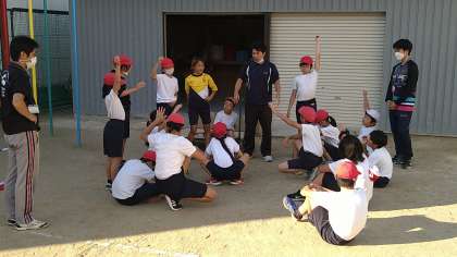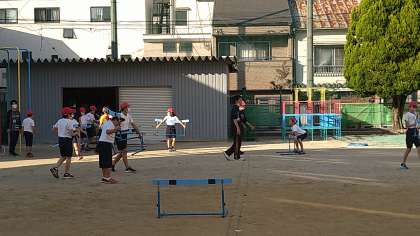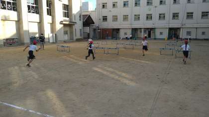 インターバル(自分の歩幅に合った距離)を見つけています。30mのロープに青・ピンク・黄緑の3色のリボンをくくりつけ同じ色のリボンのところにハードルを置くと均等間隔になります。何度か走り自分に合ったインターバルを決めています。
