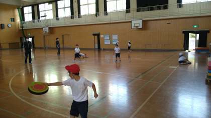 「ドッジビー」は柔らかいフリスビーのような学習用具です。3人で1チームです。先攻のチームが投げて、相手チームが守ります。投げたらキャッチするまでにベースまで走るゲームです。ただし投げたドッジビーをダイレクトキャッチするとそこでアウトです。