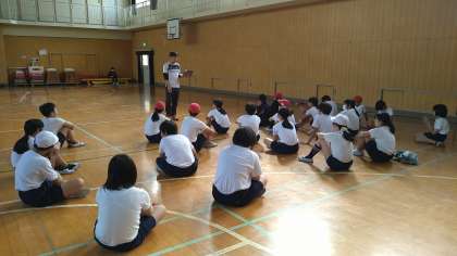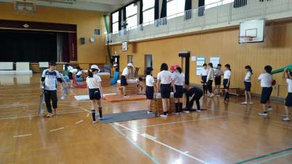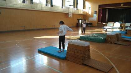 「頭跳ねとび」の練習です。台上前転から伸膝前転、そして頭跳ねとびと順を追ってスモールステップで指導しています。今日は体操のできるサポーターに技も見せてもらっています。