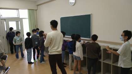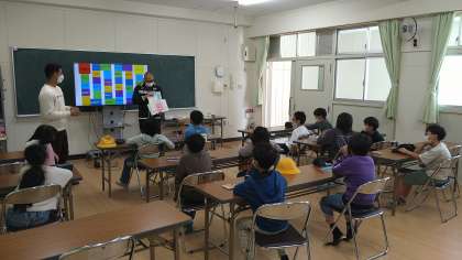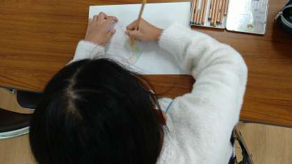 ドリルプリントを使って何が好きかを聞き取っています。そのあと、すごろくをしてアルファベット(小文字)から連想できるものを色鉛筆でかいています。