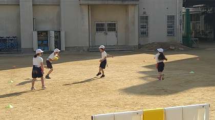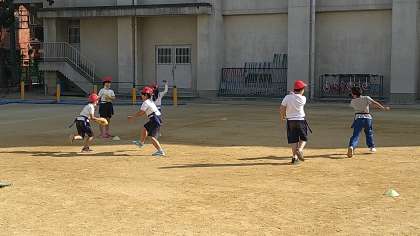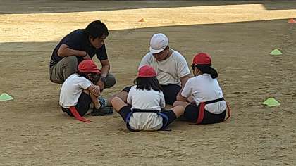 現在おこなっているゲームは「フラッグフットボール型ゲーム」です。初めのルールは指導者から提示しますが、学習をしていく中で子どもたちの考えや意見を取り入れながら変化させています。