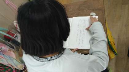 3年になってがんばっている「語り」の発表会の案内の手紙を書いています。見に来てもらいたいお家の人に向けて心を込めて書いています。
