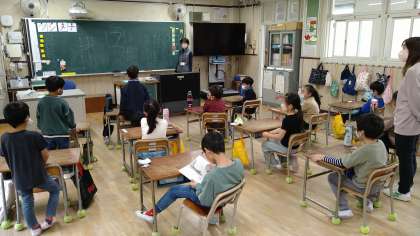 教室で見る時のマナーやルールを具体的に説明しています。その後、講堂に場所を移して鑑賞しています。鑑賞は自由鑑賞でおこなっています。
