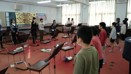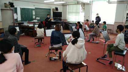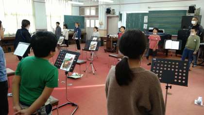 曲目はジブリアニメ、天空の城ラピュタの「君をのせて」です。歌声は、3階の音楽室から1階の職員室まで美しい歌声が響いています。