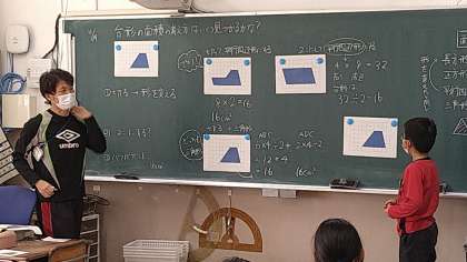 子どもたちからは、切る方法(形を変える・バラバラにする)と合わせる方法が出ています。切って三角形2つや平行四辺形にしたり、合わせて平行四辺形にしたりして面積を求めています。