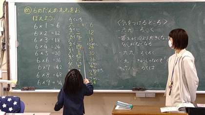 今回は、「6の段」の学習です。気をつけるところを発表しています。暗唱する時の読み方や答えが2桁になると答えの前の「が」を言わないことに気づいて発表しています。