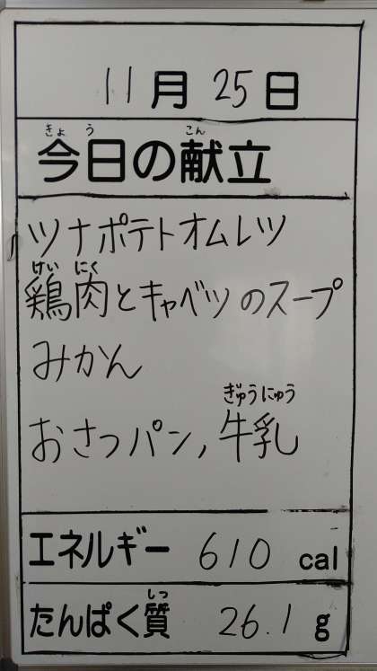 今日はツナポテトオムレツが提供されています。子どもに人気のあるツナとポテトがコラボしたオムレツになっています。