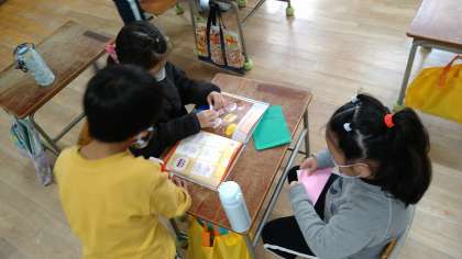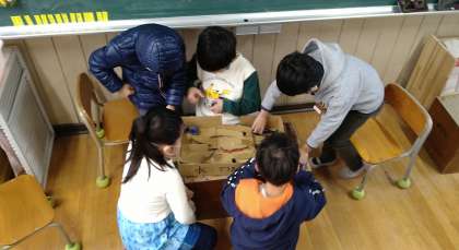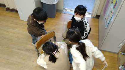 3つの係に分かれて活動しています。遊び係は休み時間のみんな遊びを決めています。飾り係は折り紙でケーキを作っています。おもちゃ係は、迷路づくりをしています。
