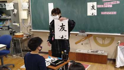 縦長の半紙に書くのは「友だち」です。この時間は、「友だち」の3文字の内、「友」の1文字と左側に書く学年と名前の1文字目の練習をしています。