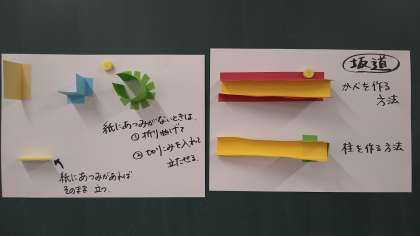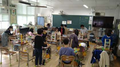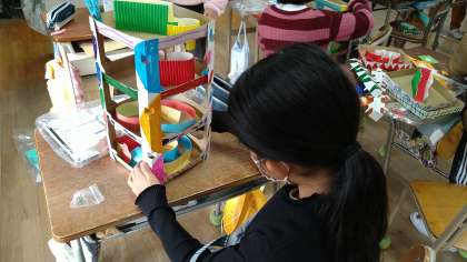 お皿台紙の組み立てと各台の制作はほぼ終わり、ビー玉を実際に転がして調整する子どもたちがたくさんいます。中には「ピタゴラスイッチ」のようにしようとがんばる児童もいます。