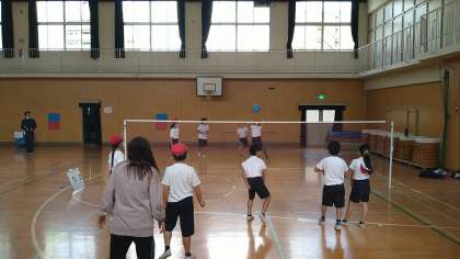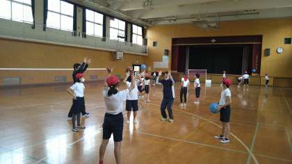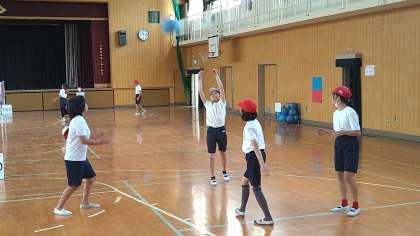 この時間の学習は、トスだけバレーボールと同じで、レシーブが「キャッチ」、アタックが「キャッチして投げ入れる」というルールでおこなっています。ただしボールはソフトバレーボールを使用しています。