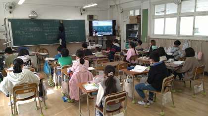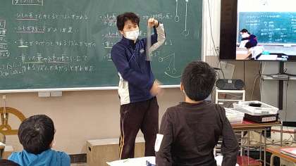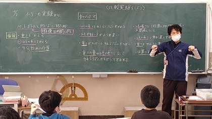 学習の導入でガリレオ・ガリレイが見つけたきまりから簡単なふりこの実験からどのような比較実験をおこなうかを話し合っています。
