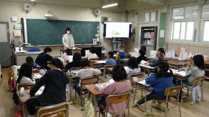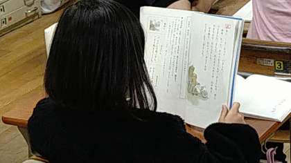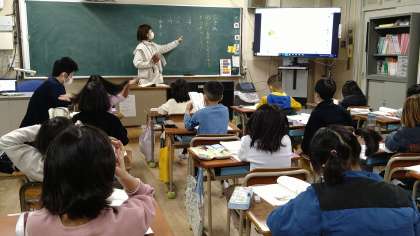 第5場面のようすについて想像しています。「場所」「人物」「時」「出来事」のポイントを押さえて学習を進めています。
