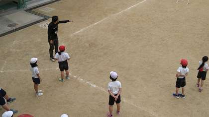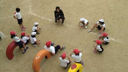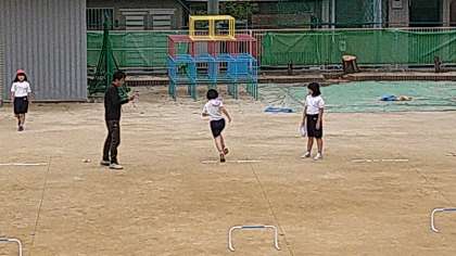 中型ハードルを使ったハードル走です。自分に合ったハードル間(インターバル)を見つけるために何度も練習しています。最後にタイムリレーをしています。
