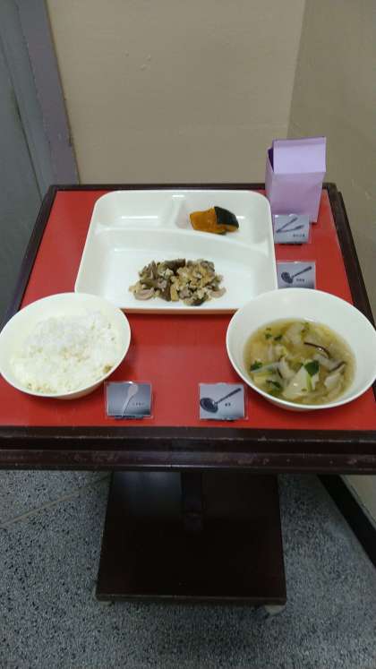 今日は1年に1度しか登場しないずいきを使った「豚肉と干しずいきのみそ煮」が提供されています。ずいきはサトイモやハスイモなどの葉柄です。薄皮を剥いだものは芋がらとも呼ばれています。