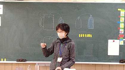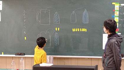 2本のペットボトルに入っている水のかさを比べる方法を考えています。子どもたちからは3つの方法が発表されています。その中から2つの方法で確かめます。