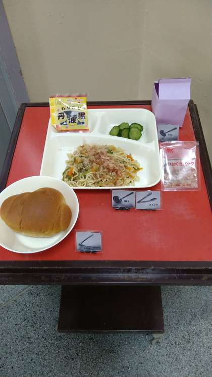 今日は「和風焼きそば」が提供されています。塩・コショウ、薄口醤油、濃口醤油で味付けされています。食べる前にかつお節をかけます。