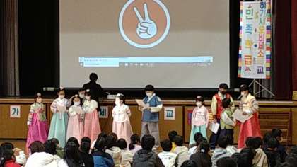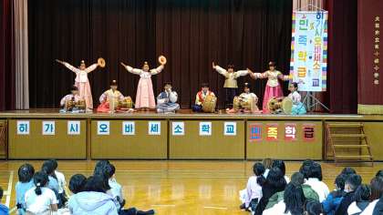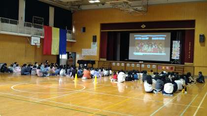 年に1回の発表会をおこなっています。これまでの民族学級の活動は、中道小学校と合同でおこなっていましたが、今年度からは、東小橋小学校単独で開催しています。中道小学校とは、互いに活動の様子を映像で送り、紹介し合っています。