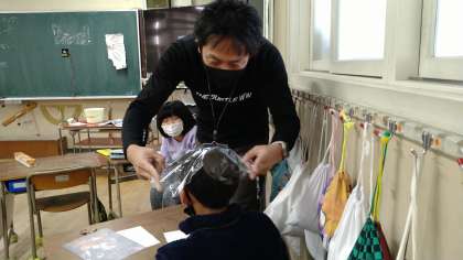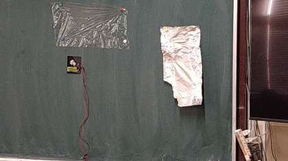 アルミホイルやサランラップには電気が流れるかを調べています。