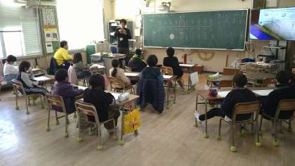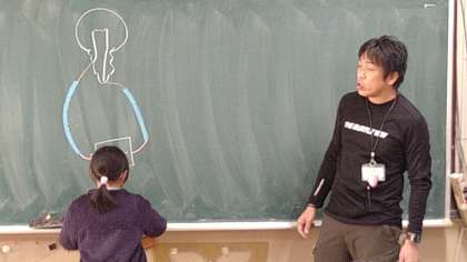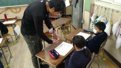 豆電球が光るしくみを考えています。豆電球と電池、導線を1本の線でつなげることで光ることを豆電球の構造も説明しながら学習を進めています。