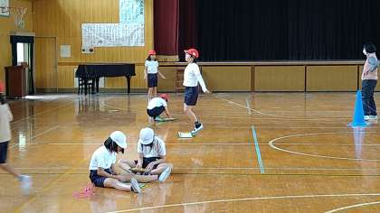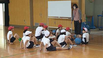 前半は短なわをしています。なわとびカードを使って1人技を練習しています。後半はプレルボールをしています。