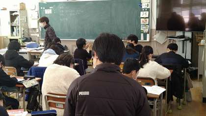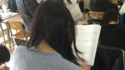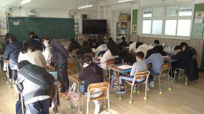広島・長崎の原爆、東京大空襲、沖縄戦の3つの中から選んでタブレット端末で調べたことを1人ずつ発表しています。
