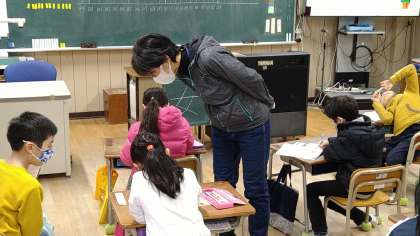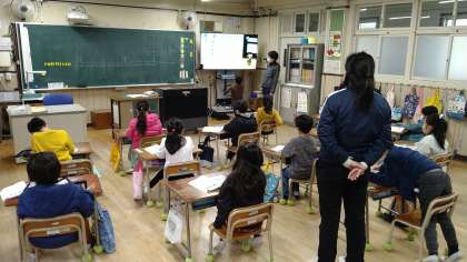 黒板に数直線をかいて、子どもたちがどのように答えを導き出したかを説明しています。