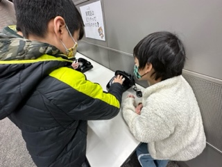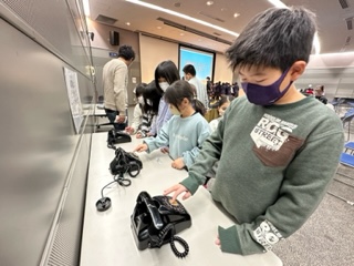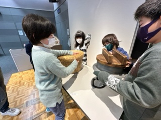 昔の道具を触る体験をしています。