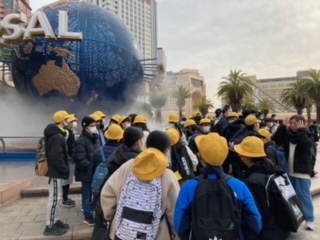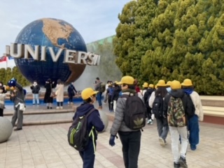 楽しみにしていたユニバーサルジャパンへ卒業遠足に行っています。寒い中にもかかわらず、たくさんの人が来ています。どこから行こうか、話しながら入場しました。