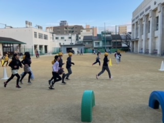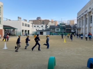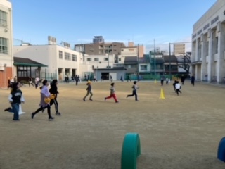今朝は1年生と6年生のマラソンです。先週は6年生が卒業遠足でいなかったので、今日が今年初のマラソンです。寒さに負けないように走っています。