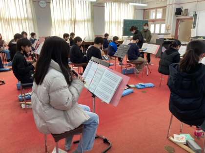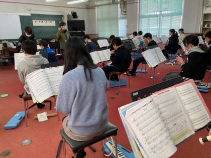 リコーダーと鍵盤ハーモニカで「カノン」を演奏しています。みんなが力を合わせて自分のパートを練習しています。美しい旋律で揃っていました。
