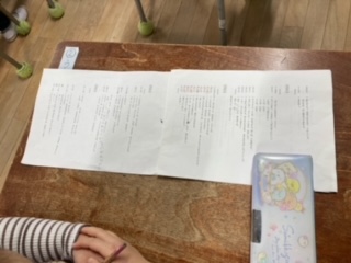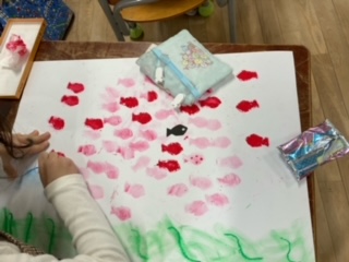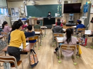 「スイミー」の練習をしています。今日は役割読みでセリフを読んでいます。昨日は図工で魚の型を使いながらパスを使ってたくさんの魚を描いていました。