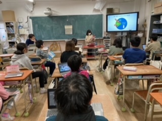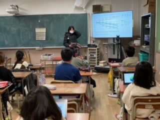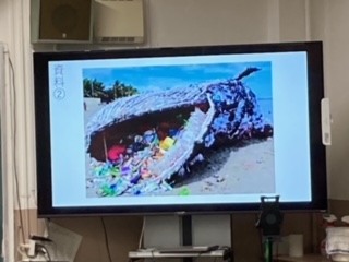 テーマを決めて取り組んでいる事を一人ずつ発表しています。環境問題や少子高齢化などをパワーポイントを使いながら説明して、互いに感想を言っています。