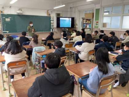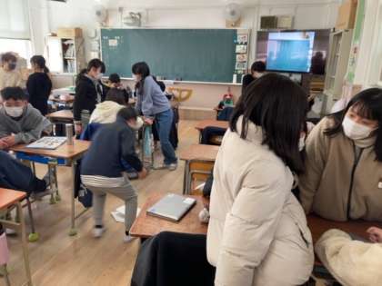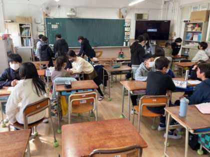 総合の時間です。修学旅行の動画を見てから、茶話会に向けて出し物の話し合いをしています。卒業が着々と近づいてきています。