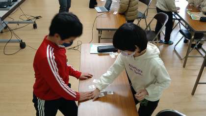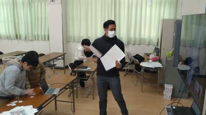 学校にあるさまざまな教室の絵カードを使ってカルタ大会を楽しんでいます。職員室・音楽室・図書館・運動場などの絵カードがあります。